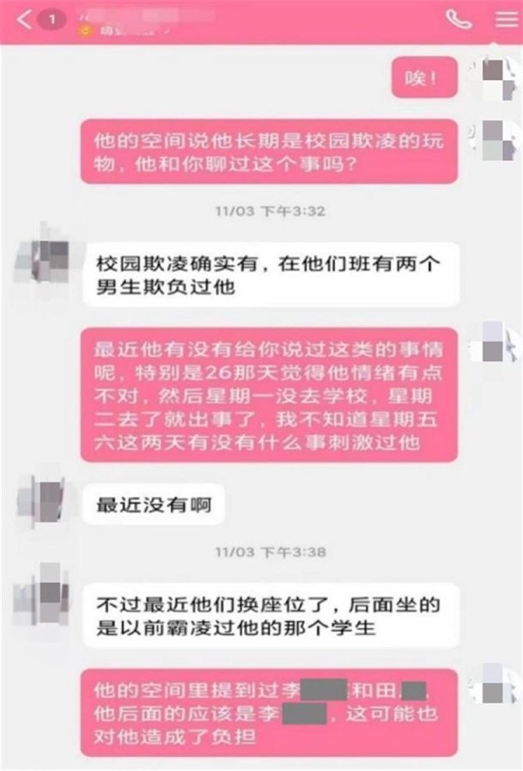 事发后,杨先生通过小杰的QQ联系到其同学,询问小杰生前暗指其被长期欺凌的情况,对方回复“校园欺凌确实有,他们班有两个男生欺负过他”。