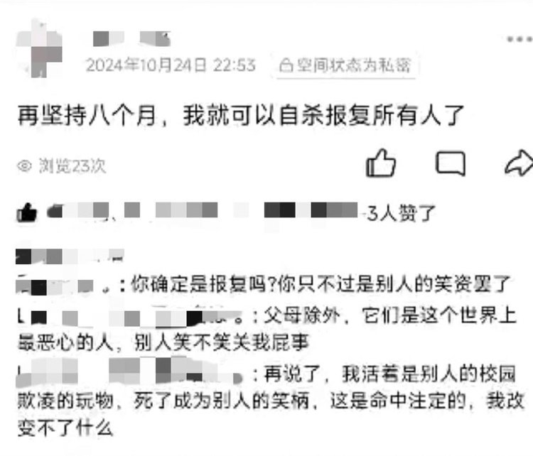 处理后事时,杨先生查看了小杰2023年11月至2024年10月29日的QQ空间,发现小杰生前疑似在学校遭到同学的欺凌、老师的排挤和嘲讽。他认为,这些可能是小杰坠楼的诱因。
