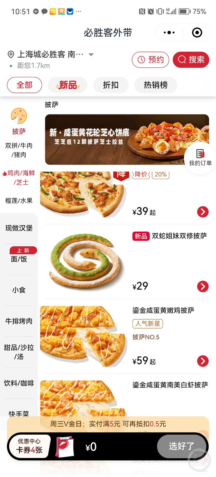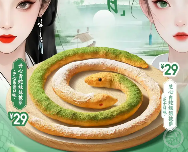 4月2日,上游新闻记者登录必胜客小程序发现,“双蛇姐妹双修披萨”,标注为新品,价格为29元,点击后跳转页面为新品“芝心白蛇姐姐披萨”“开心青蛇妹妹披萨”。