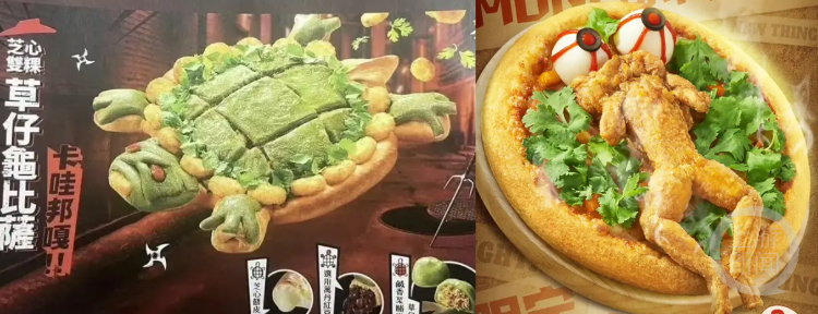 记者注意到,此前必胜客曾推出过哥布林披萨、草仔龟披萨、芝心蛇进草仔龟披萨等产品,也让网友觉得比较抽象。哥布林披萨是一只牛蛙趴在一个披萨上方,周围摆设香菜,牛蛙头部位置摆着两个白色的“眼球”;草仔龟披萨则将披萨做成乌龟模样,乌龟背部的食材为绿色;芝心蛇进草仔龟披萨则是在草仔龟披萨背上再摆上一条蛇。