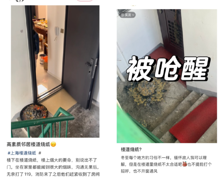最近,不少上海市民在网上发视频吐槽邻居在楼道内烧纸太过危险。