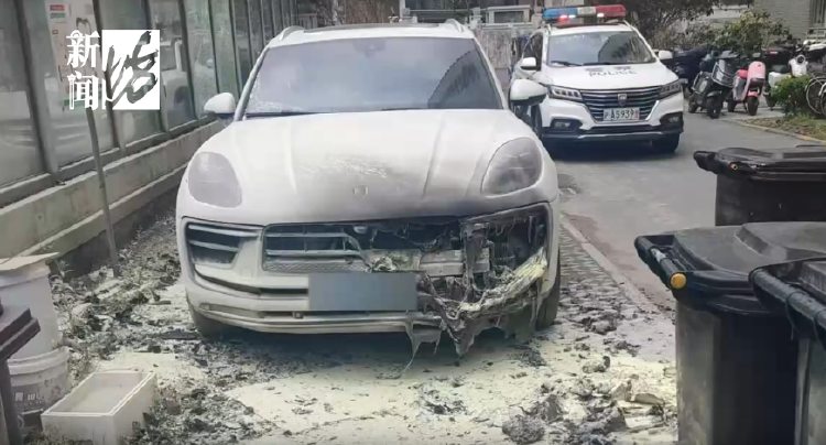 虽然未造成人员伤亡,但停在垃圾桶边上的一辆保时捷却遭了殃,车头被烧毁了。