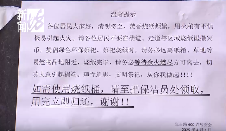 不少物业已提前行动,在小区门口等显眼位置张贴告示,提醒居民不要在小区广场、楼道、绿地等公共场所焚烧祭祀用品。同时,还准备了铅桶,供居民们免费使用,尽可能地防范消防安全隐患。