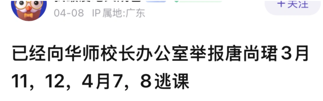 该网友称,2025年3月10日,唐尚珺去北京拍摄,3月12日周二早机飞回广州,为了炒作这两天无故逃课。