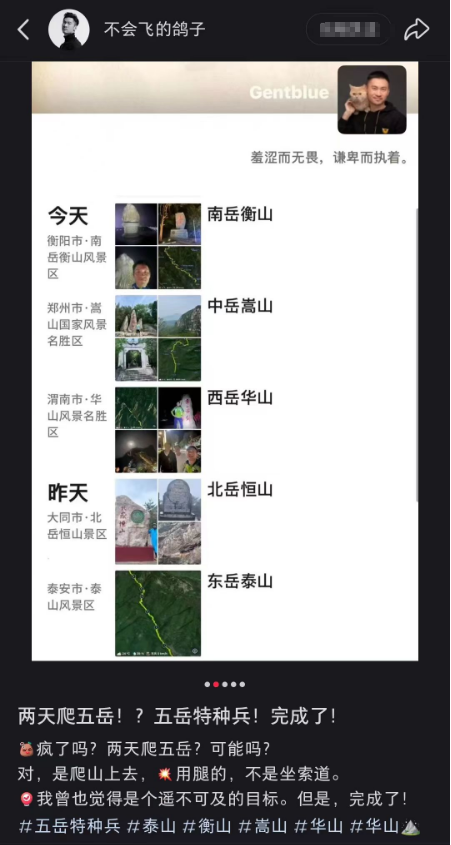 葛先生发布笔记称两天完成爬五岳挑战。网络截图
