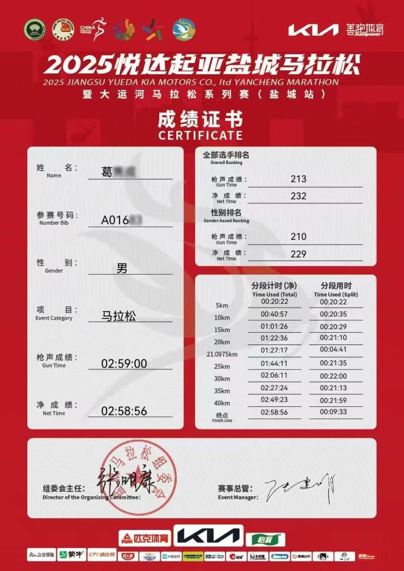 葛先生全程马拉松成绩在3小时以内。受访者供图