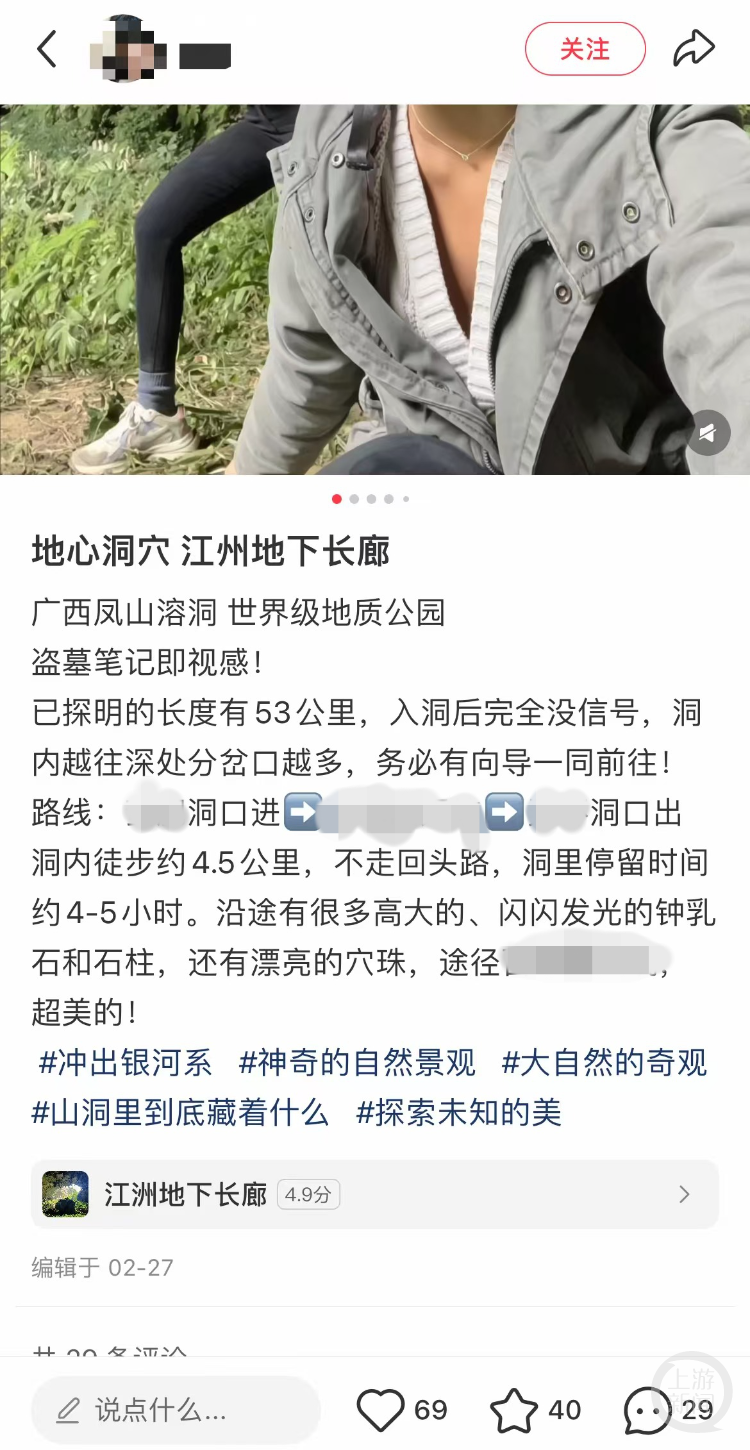 记者搜寻网络社交平台发现,不少探险类帖子对该长廊多有提及。有博主撰文表示:“该洞内情况复杂,建议不要贸然入洞,只在洞口拍照留念即可。”也有博主发布了线路攻略,甚至建议“从XX洞口进,XX洞口出”,并特别提及沿途有闪闪发光的钟乳石。