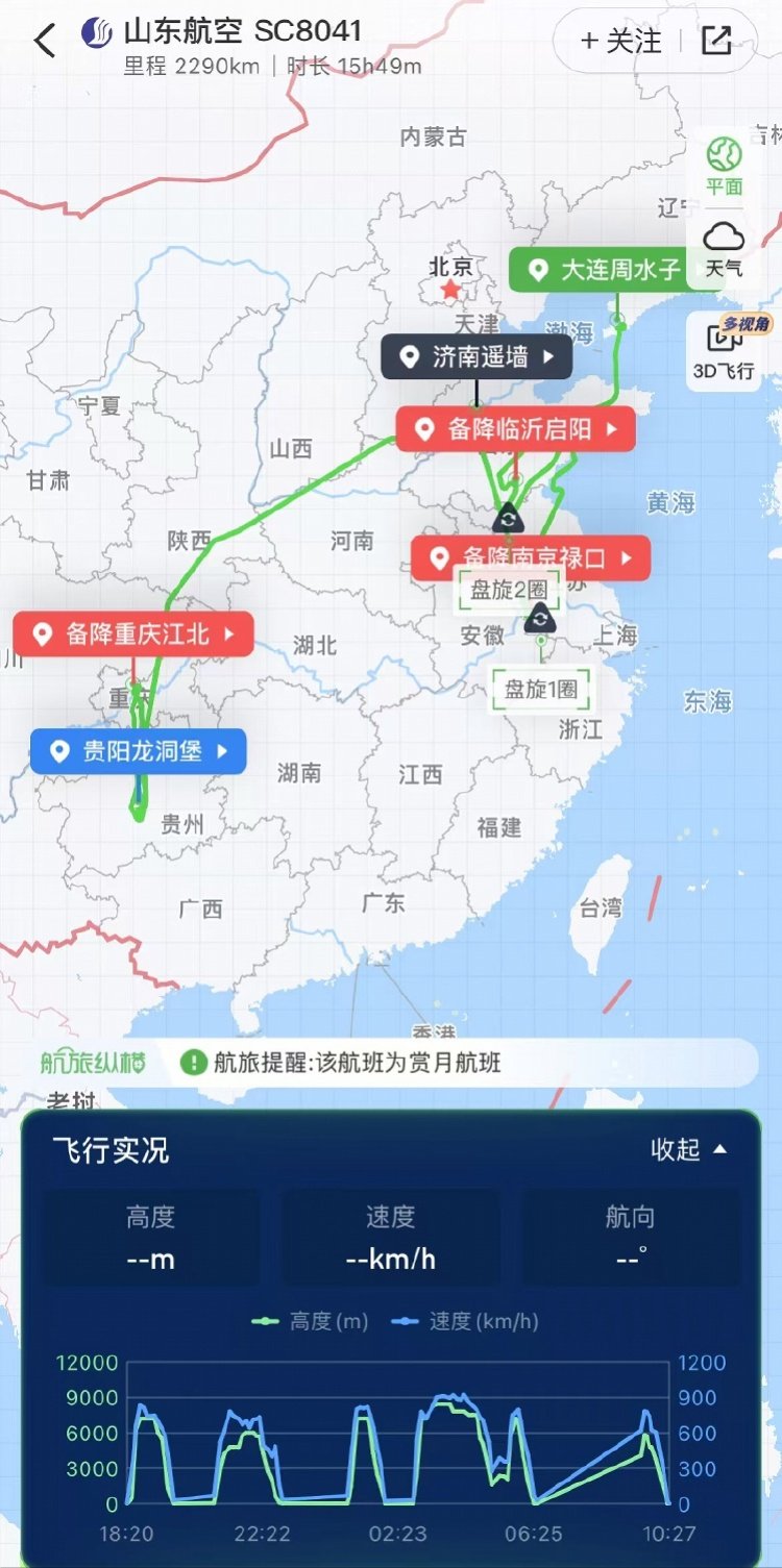 关于SC8041航班情况,山东航空表示:大连-济南段航班起飞后,受天气影响备降临沂,临沂起飞后因航路天气无法绕飞备降南京,后于5月1日凌晨2:00安全抵达济南。济南-贵阳段航班于2:52起飞,因贵阳机场突发低云不满足落地标准备降重庆,天气好转后,于10:17安全抵达贵阳。