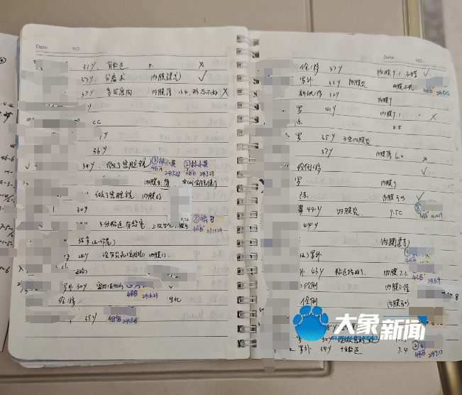 在洗手台上,放置着多瓶消毒液,还有一把手术钳被放在上面,衣柜里有大量的黄色医疗废物包装袋。在工作台一个打开的笔记本上,清楚记录着在这里进行胚胎移植的代孕女子身体情况,包括该女性年龄、是否曾移植、宫腔及内膜等情况。