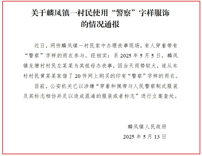 5月13日,云南威信县麟凤镇人民政府微信公众号“雪山胜境 最美麟凤”发布情况通报称,近日,网传麟凤镇一村民家中办理丧事现场,有人穿着带有“警察”字样的雨衣参与。经核实:系2025年5月5日,麟凤镇龙塘村村民左某某为其祖母办丧事,因当天雨势较大,遂从本村村民黄某某家借了20件网上购买的印有“警察”字样的雨衣。