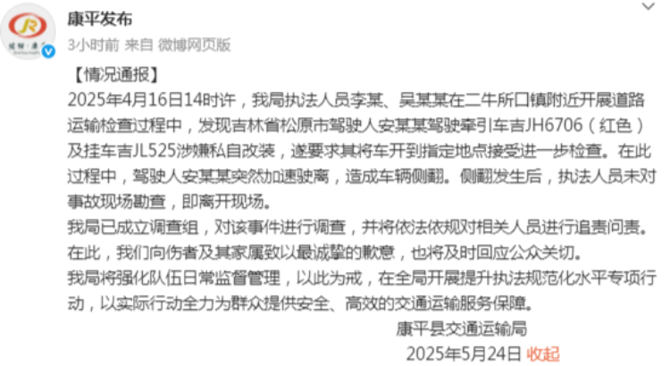 5月24日,辽宁沈阳康平县交通运输局发布情况通报称,4月16日14时许,该局执法人员李某、吴某某在二牛所口镇附近开展道路运输检查过程中,发现吉林省松原市驾驶人安某某驾驶牵引车吉JH6706(红色)及挂车吉JL525涉嫌私自改装,遂要求其将车开到指定地点接受进一步检查。在此过程中,驾驶人安某某突然加速驶离,造成车辆侧翻。侧翻发生后,执法人员未对事故现场勘查,即离开现场。
