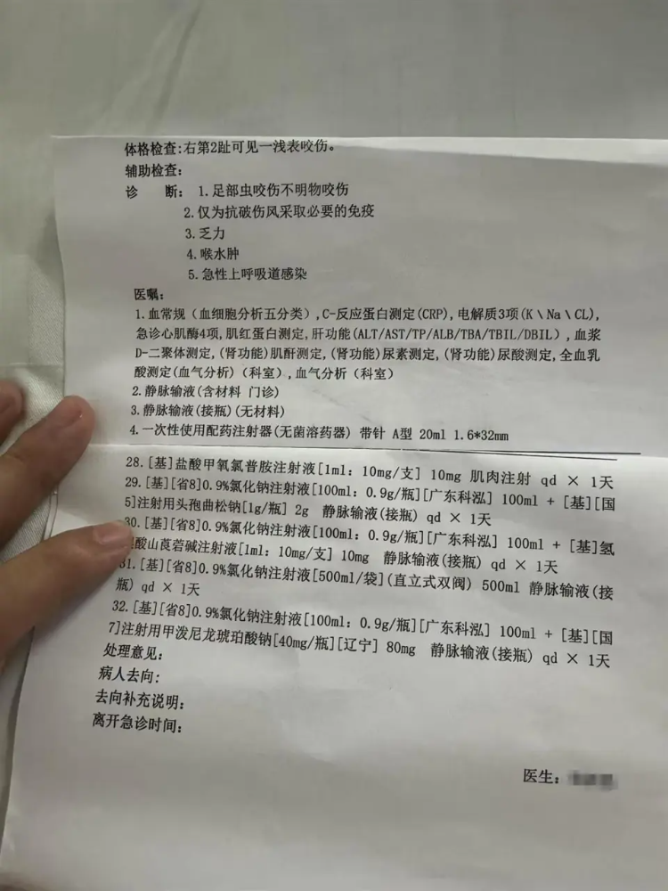 3日,九派新闻联系到该网友徐先生,其介绍,“诊断书虽然写的是不明物,但那伤口明显是蛇的牙印,有两个像针眼一样的小孔。我妹妹在三亚市中心医院治疗时已经出现了麻木、呕吐的症状。”