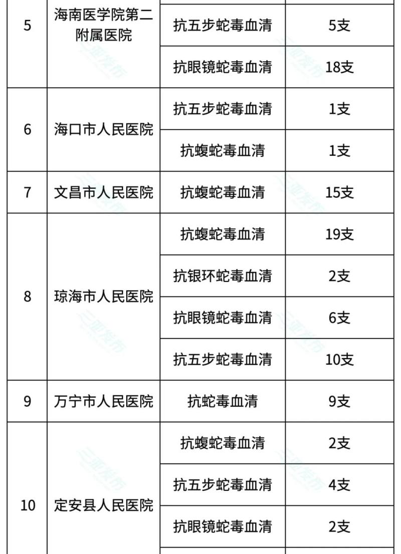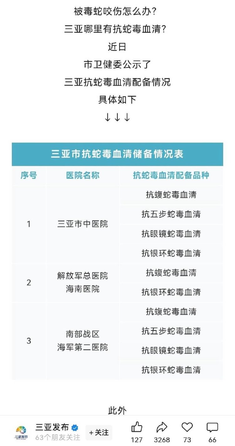 三亚公布的抗蛇毒血清医院信息(三亚发布官方账号截图)
