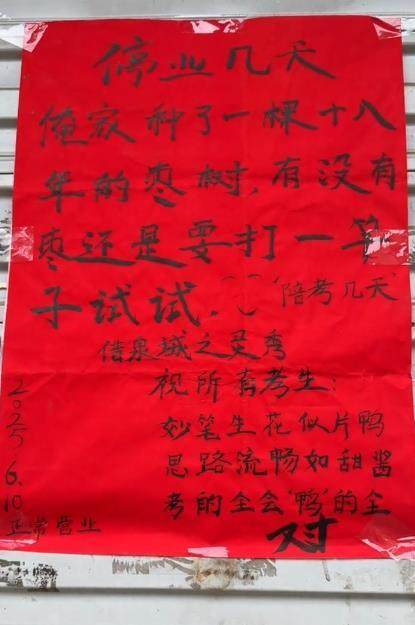 店主赵先生是山东菏泽人。当日,他通过电话向极目新闻记者介绍,女儿出生在河北唐山,今年18岁,平时由长辈照顾,成绩还行。高考前,他和妻子前往唐山,一起为女儿加油鼓劲。“希望用真诚的语气,告诉顾客店里休息几天,陪孩子高考。”他说,“其实没有网友说的那么有文采,当时没怎么考虑。”