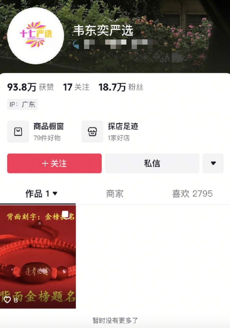 其中,账号“韦东奕严选”拥有18.7万粉丝,该账号在高考首日发布图文信息,带货9.9元的高考幸运绳。