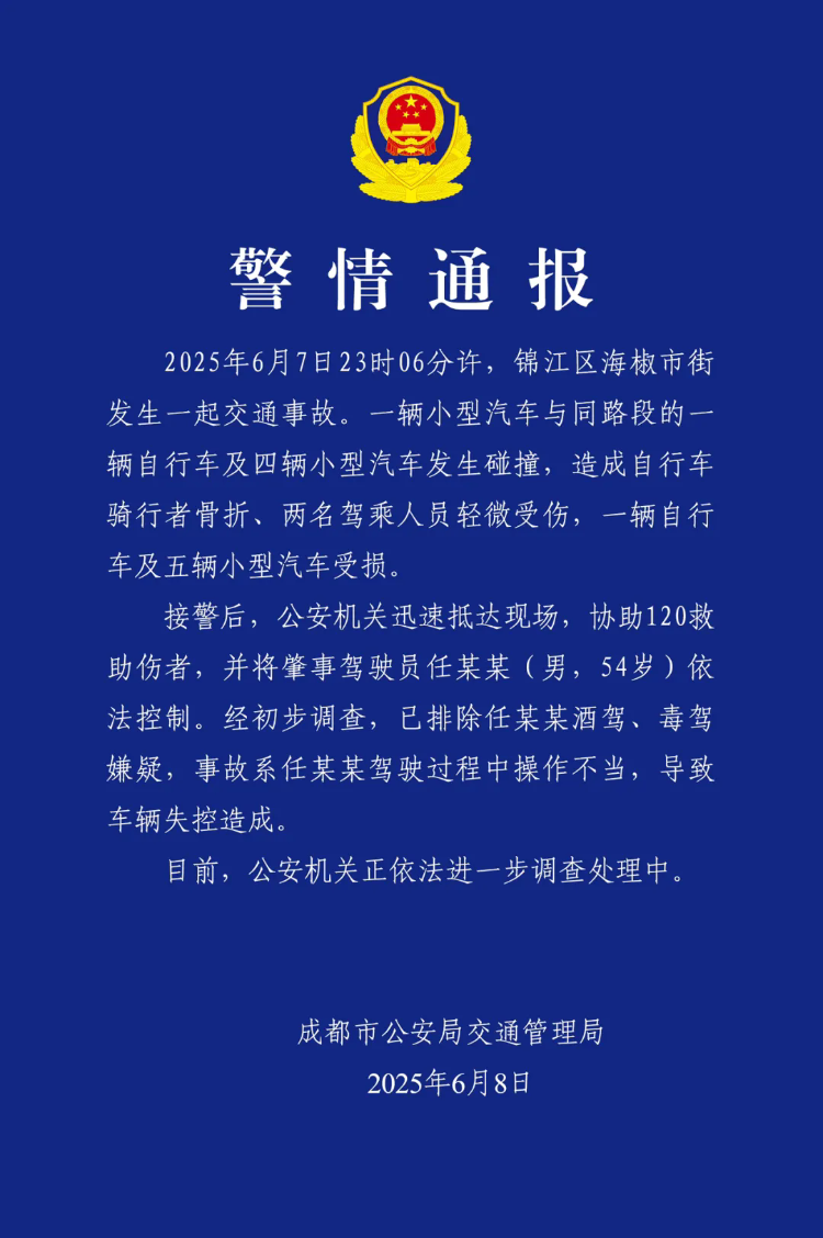 成都发生一起交通事故,多车被撞 交警:司机操作不当