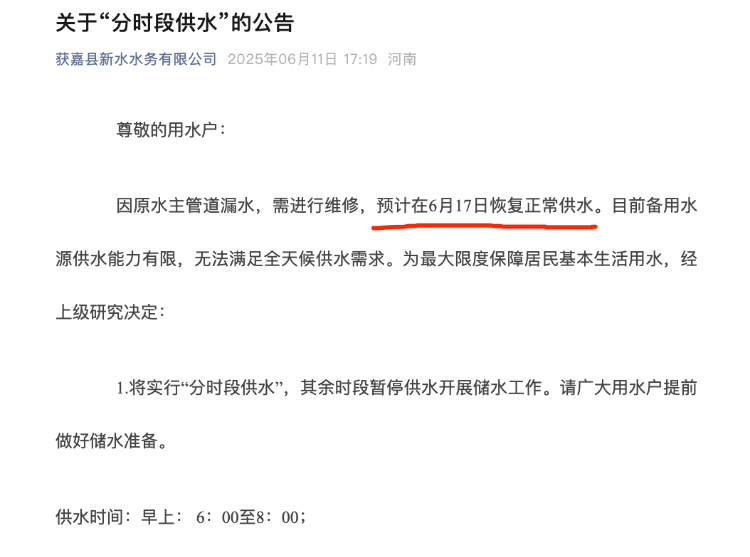 6月13日,上游新闻(报料邮箱:baoliaosy@163.com)记者查询获嘉县水务有限公司官方微信公众号发现,6月11日发布的一则《“分时段供水”的公告》称,因原水主管道漏水需维修,预计6月17日恢复正常供水。目前备用水源供水能力有限,无法满足全天候供水需求,为保障居民基本生活用水,将实行“分时段供水”,非供水时段暂停供水以开展储水工作。公告末尾提醒用户及时储水、减少高峰期用水。