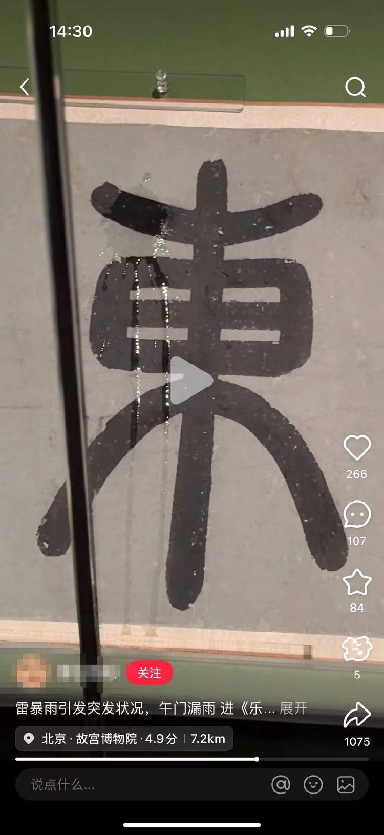 新京报消息,6月14日,北京大雨。记者注意到,国内某社交媒体平台有人发布视频称,“因突发雷暴雨,故宫‘乐林泉’大展展柜里的《东园图》卷被水给淋湿了。”视频内容显示,展柜图卷的“東”字被淋湿。