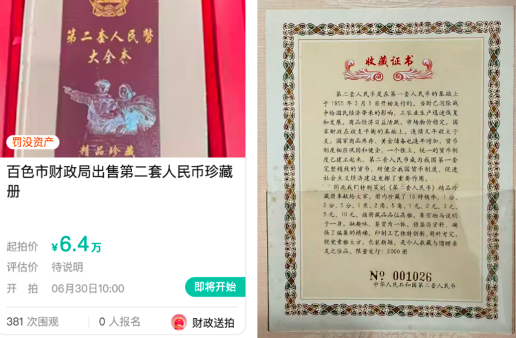 近日,广西百色市财政局在阿里资产拍卖平台发布了一则拍卖公告,称拟于6月30日10时起,公开拍卖一套第二套人民币珍藏册,起拍价6.4万元。由于该套珍藏册为被查封物品,引发众多网友关注。截至6月26日,拍品页面显示已有380余人围观,13人设置“开拍提醒”。