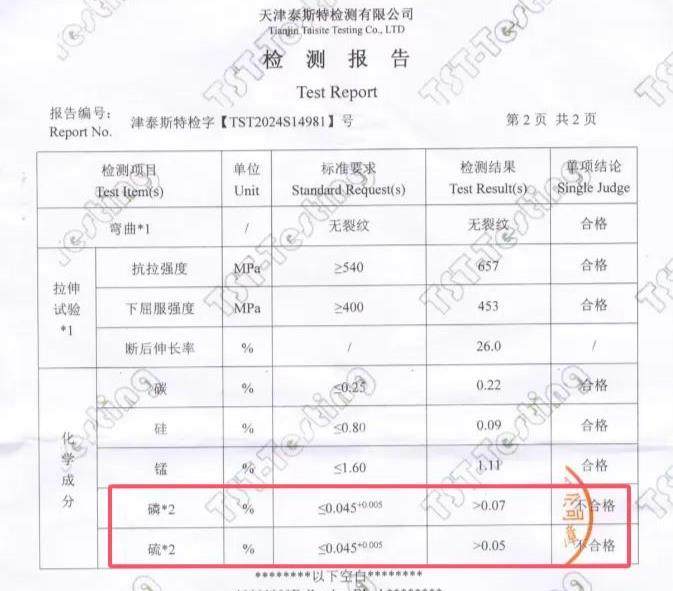 “手都能掰断的钢筋也合格?那些检测合格的钢筋,是不是我反映的批次钢筋呢?”纪先生说,当时拉来的两车钢筋有六七十吨重,随后他又自费检测了留存的部分钢筋,显示抗拉强度、下屈服强度合格,但磷、硫化学成分超标不合格。因为种种原因,他于去年9月离开了该项目。