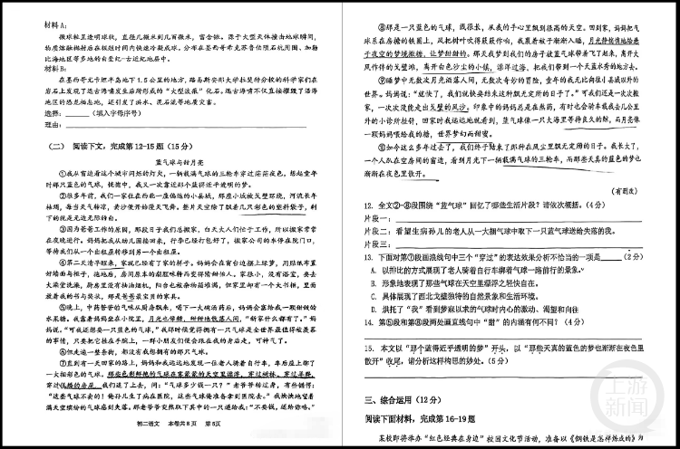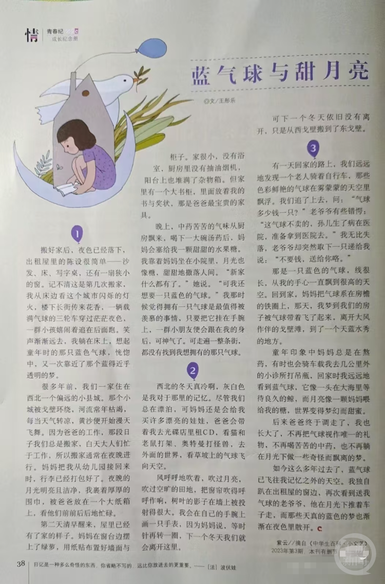 “在社交媒体上,有上海的考生在我的评论区里跟我说,我这篇文章被用为他们这学期区统考的考题了,我才知道。”6月30日,王彤乐告诉上游新闻记者,《蓝气球和甜月亮》这篇文章是自己在2022年写的,2023年发表在《中学生百科》上,后来被《青年文摘》杂志转载。“这篇文章是对我童年时期一段戈壁生活的真实记录,所以写作的过程中并没有考虑太多,都是凭感情去写的。”