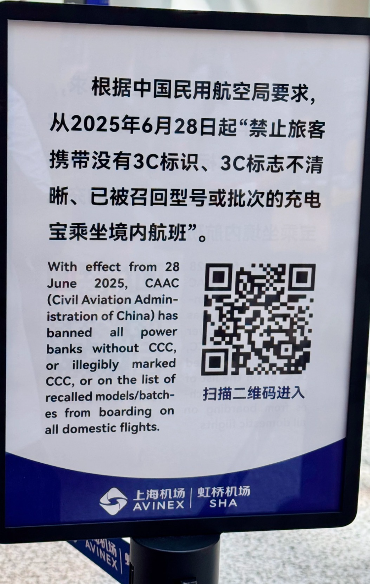 上海机场、虹桥机场就无3C标识的充电宝无法携带提醒旅客。 网络图