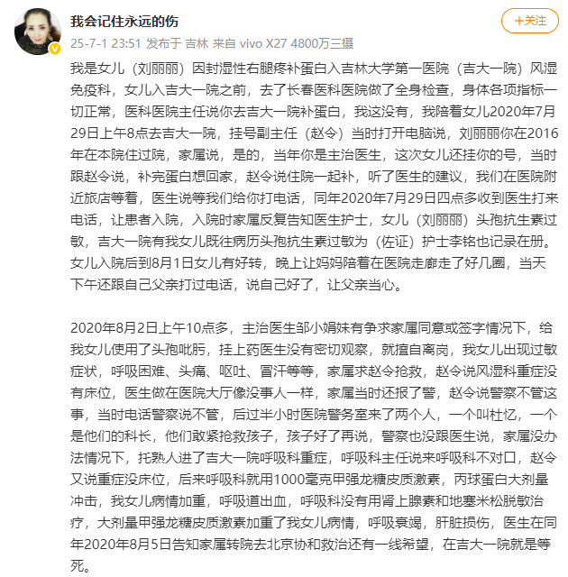 当事人@我会记住永远的伤(张女士) 发文回忆事发经过:称在家属多次告知刘丽丽有头孢类药物过敏病史的情况下,医生仍为其注射头孢吡肟。而在注射后,刘丽丽病情加重,院方并未及时救治。