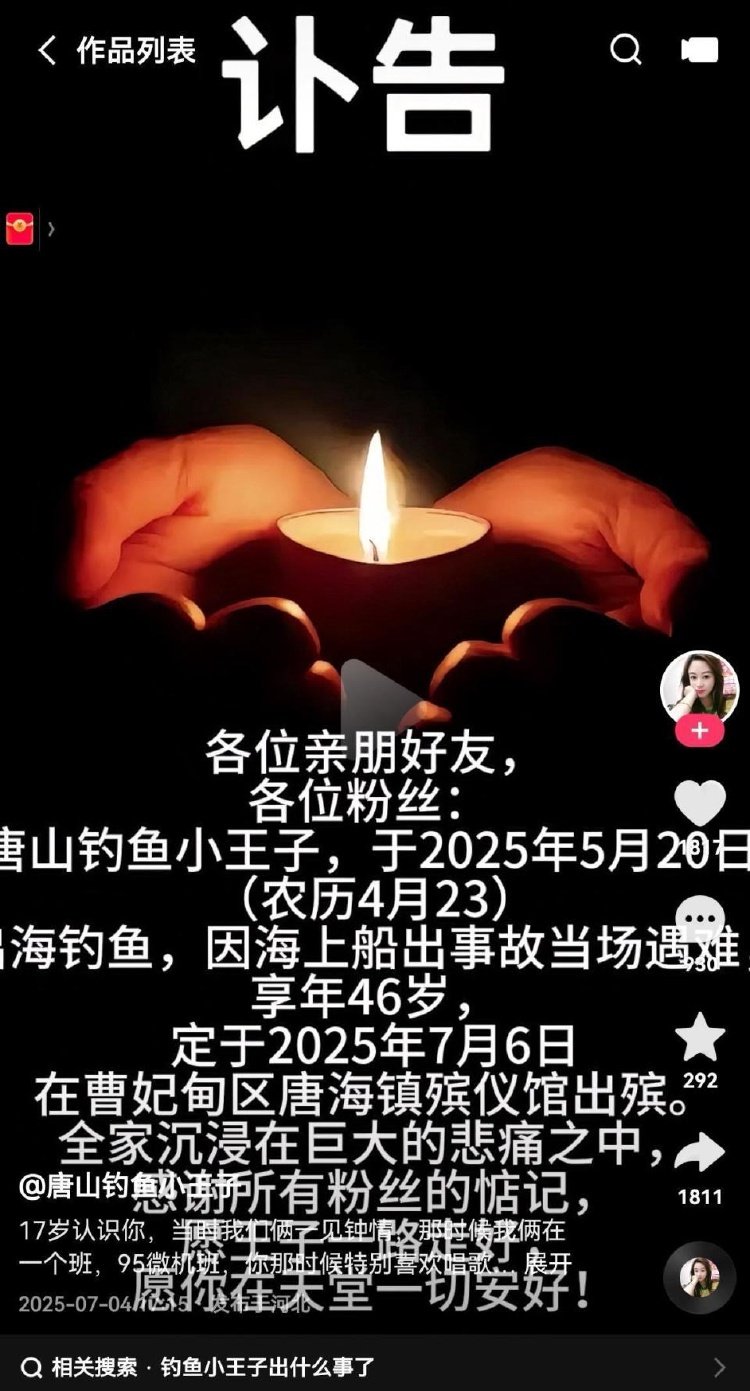 讣告说,各位亲朋好友和粉丝:唐山钓鱼小王子于2025年5月20日出海钓鱼,因海上船出事故当场遇难,享年46岁,定于2025年7月6日在曹妃甸区唐海镇殡仪馆出殡。全家沉浸在巨大的悲痛之中,感谢所有粉丝的惦记。愿王子一路走好,愿你在天堂一切安好!