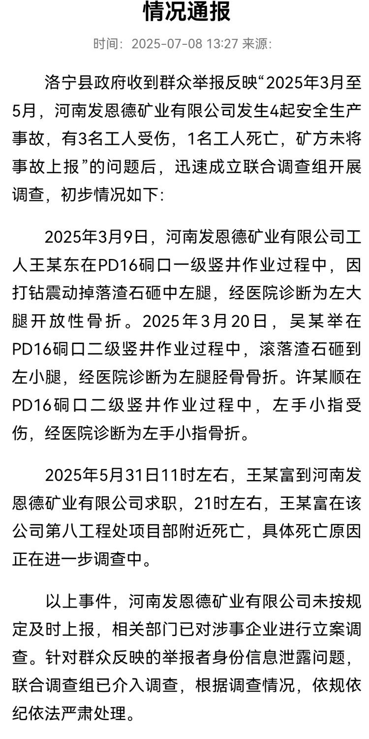7月8日,洛宁县发恩德事件联合调查组发布通报,洛宁县政府收到群众举报反映“2025年3月至5月,河南发恩德矿业有限公司发生4起安全生产事故,有3名工人受伤,1名工人死亡,矿方未将事故上报”的问题后,迅速成立联合调查组开展调查,初步情况如下: