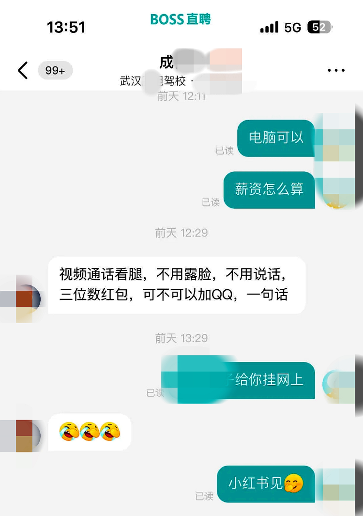 她给记者发来的对话截图显示,招聘公司为武汉XX驾校,负责招聘的人为该公司招聘人员成某某。对话显示,小诗问“薪资怎么算”,对方却发来“视频通话看腿,不用露脸,不用说话,三位数红包,可不可以加QQ,一句话”等信息。被小诗怒怼后,对方表示:“这是发错了。”小诗追问:“什么岗位要看腿啊?”对方回应:“不是,正经工作。那个人可能发错了。”