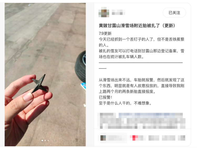 记者注意到,另一名游客在社交平台晒图称:“从滑雪场出来不远,车胎就报警,然后就发现了这个东西(铁蒺藜),明显就是有人故意投放的,导致我的两条新胎直接报废。已报警!”10日,该游客告诉上游新闻记者,她的车胎是6月29日在甘露山滑雪场附近被扎的。“听说抓了一个(嫌疑人)。”