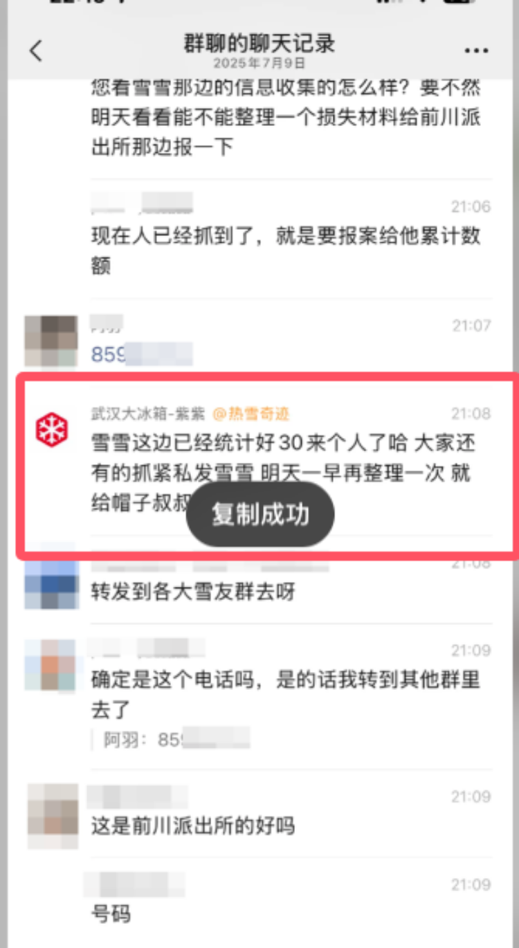 据了解,甘露山国际滑雪场位于武汉市黄陂区甘露山文创城度假区内,该滑雪场总建筑面积约9万平方米,其中武汉城建热雪奇迹约6万平方米,冰雪主题商业约3万平方米。星星晒出的截图显示,在一个滑雪户外互动群内,有人称撒钉子的嫌疑人已被警方抓到,现在需要统计受害人。疑似城建热雪奇迹的工作人员“武汉大冰箱-XX@热雪奇迹”称,她已经统计好30多人。“大家还有的抓紧私发,明天一早再整理一次,就给警察了。”