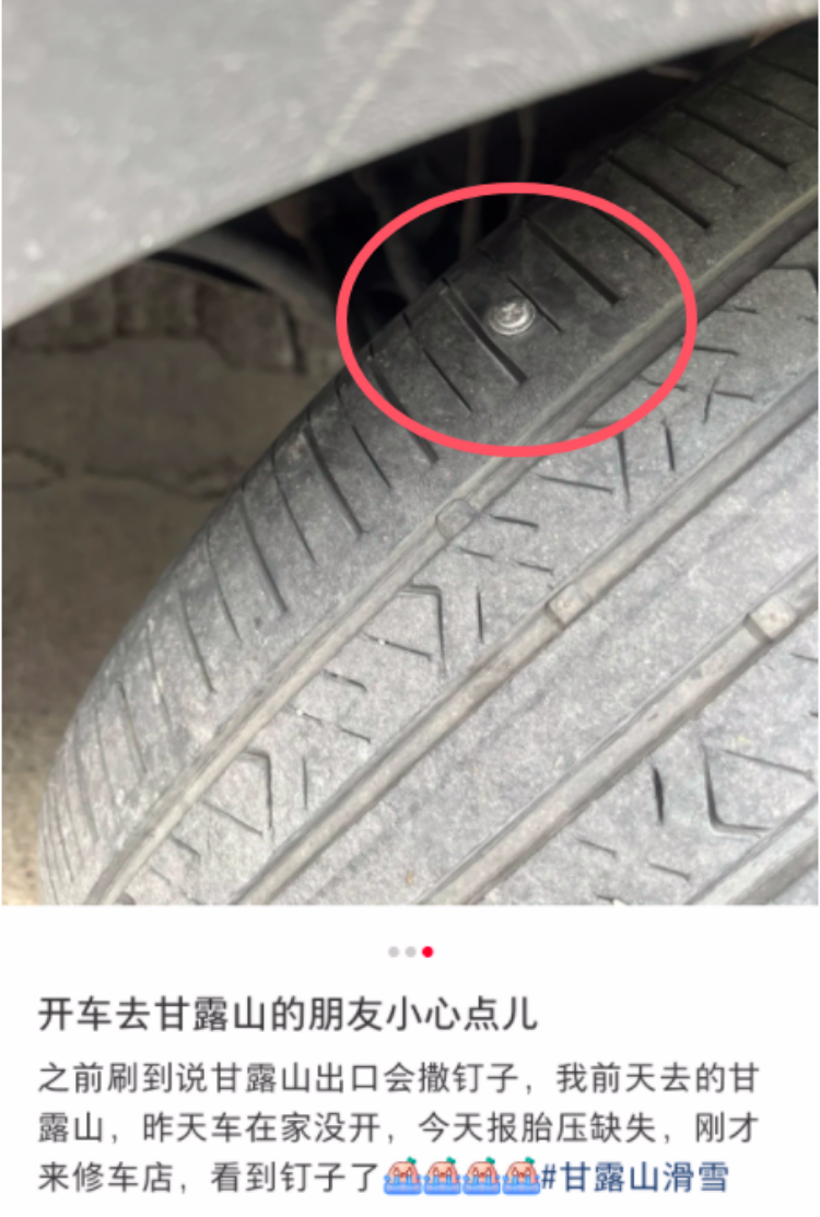 一网友发帖称,在甘露山滑雪场附近自己的车胎被扎了。网络图