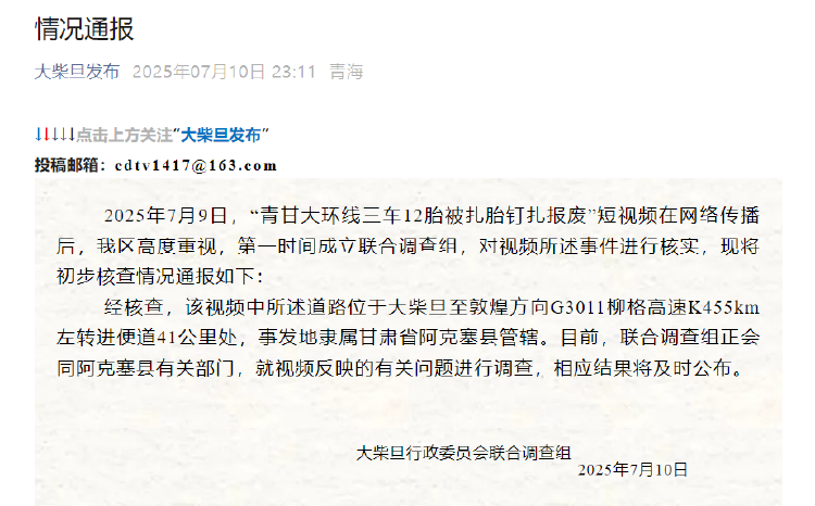 2025年7月9日,“青甘大环线三车12胎被扎胎钉扎报废”短视频在网络传播后,我区高度重视,第一时间成立联合调查组,对视频所述事件进行核实,现将初步核查情况通报如下: