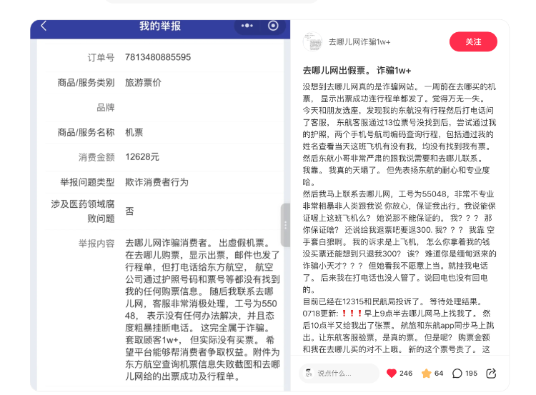 发帖网友晒出的举报截图显示,其消费金额为12628元。在帖子中该网友称,去哪儿客服称保证其出行,但又不能保证其上预订的航班飞机;说可以退票,但只能退300元。此帖引发网友热议,部分网友表示经历过类似的遭遇。记者注意到,网友“进击的悲伤蛙”也发帖吐槽,“在去哪儿买的机票,官网查不到信息。”