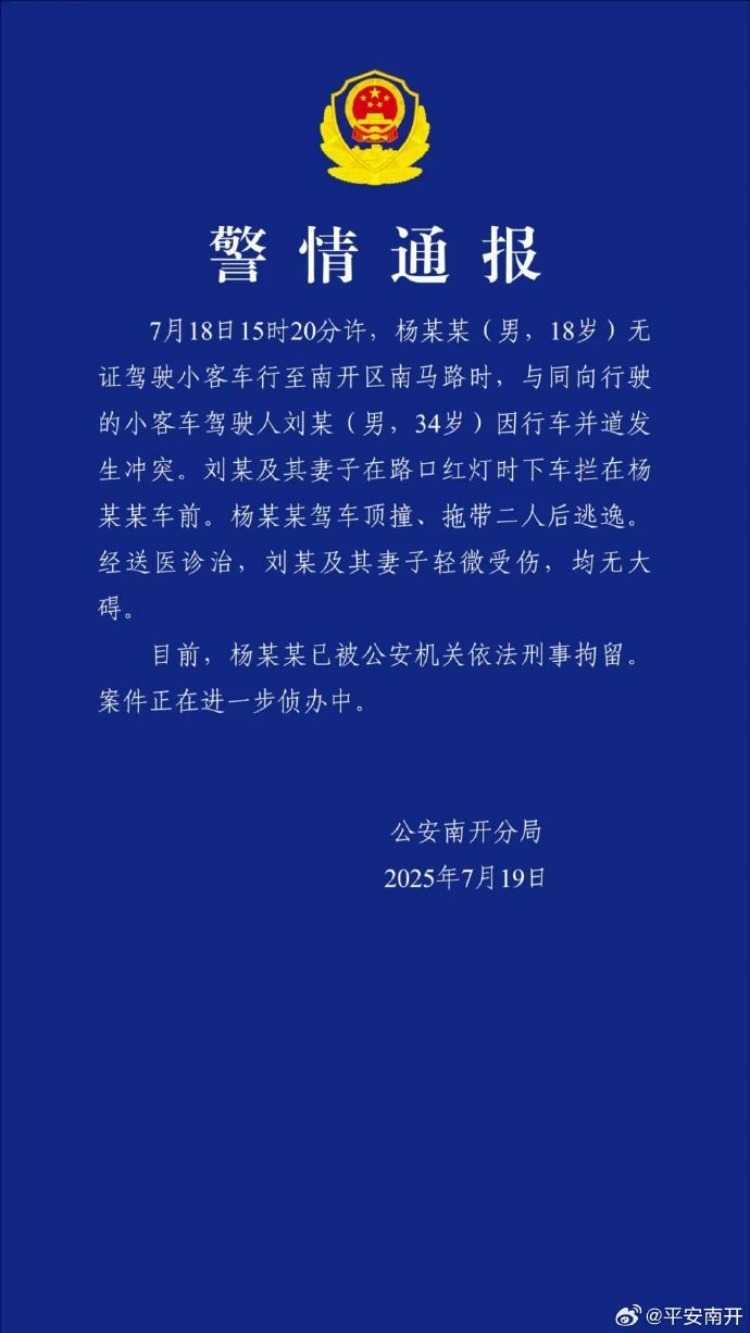 天津警方:18岁男子无证驾驶并顶撞、拖带二人后逃逸,已刑拘