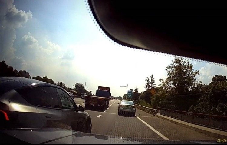 根据网友“桃子”的行车记录仪显示:7月22日下午6点过,她驾车驶入绕城高速北新收费站时,一辆川A牌照的特斯拉汽车曾试图从右侧进行变道插队。网友“桃子”称,当时B柱盲区较大没看清该车,自己就正常驾驶,没有对其避让。