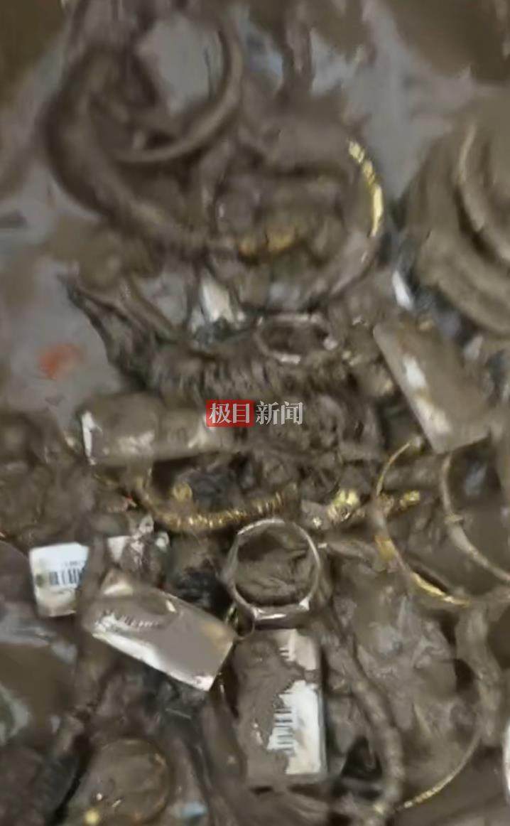 洪水退去后,叶先生发现店内的货柜及柜内的金银首饰被冲走,保险柜也被冲走。保险柜里有新货、回收的旧料和现金。报警后,警方在店门口拉了警戒线,派人值守、管控现场。他告诉记者,店里几名员工在店门口及附近淤泥里捡回约一公斤的金银首饰。另外,有居民捡到后交还给了店里,暂不知道有没有其他人捡到,“昨天,街上不少人在‘捡黄金’。”