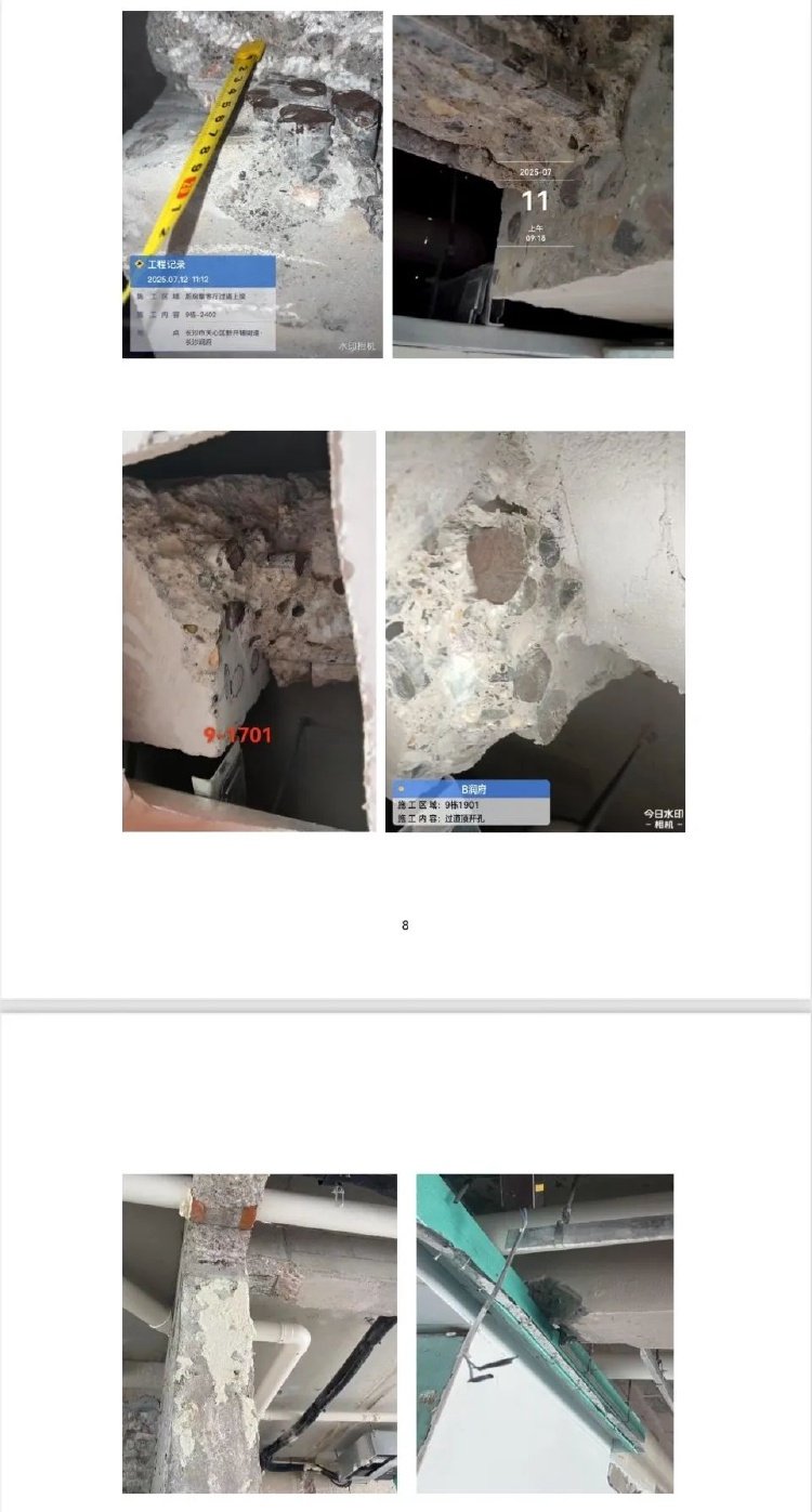 针对业主担心的结构安全问题,湖南湖大土木建筑工程检测有限公司于7月4日开展检测工作,并于8日出具检测报告,检测结论为“被检测混凝土次梁和存在类似切损现象的楼面次梁的局部破损不影响房屋整体结构安全,对构件自身已造成损伤,须进行加固修缮处理”。