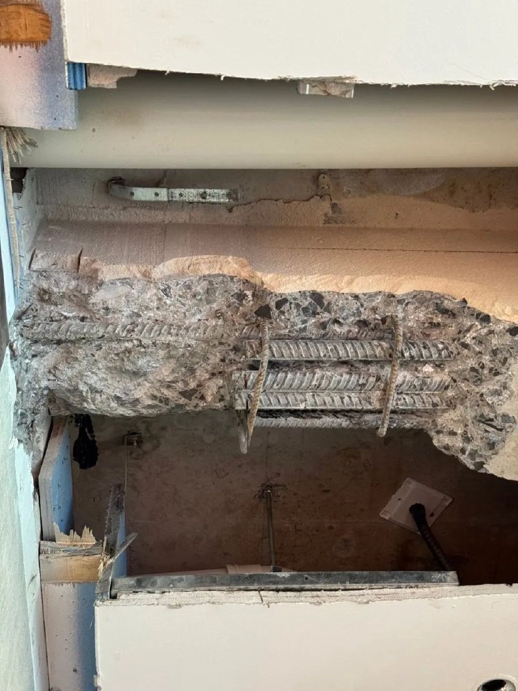 李廷说,那户人家因不满意开发商的装修风格,拆掉了所有的精装修。邻居发现承重梁下端多根受力主筋被人为切断后,第一时间将照片发给了李廷。