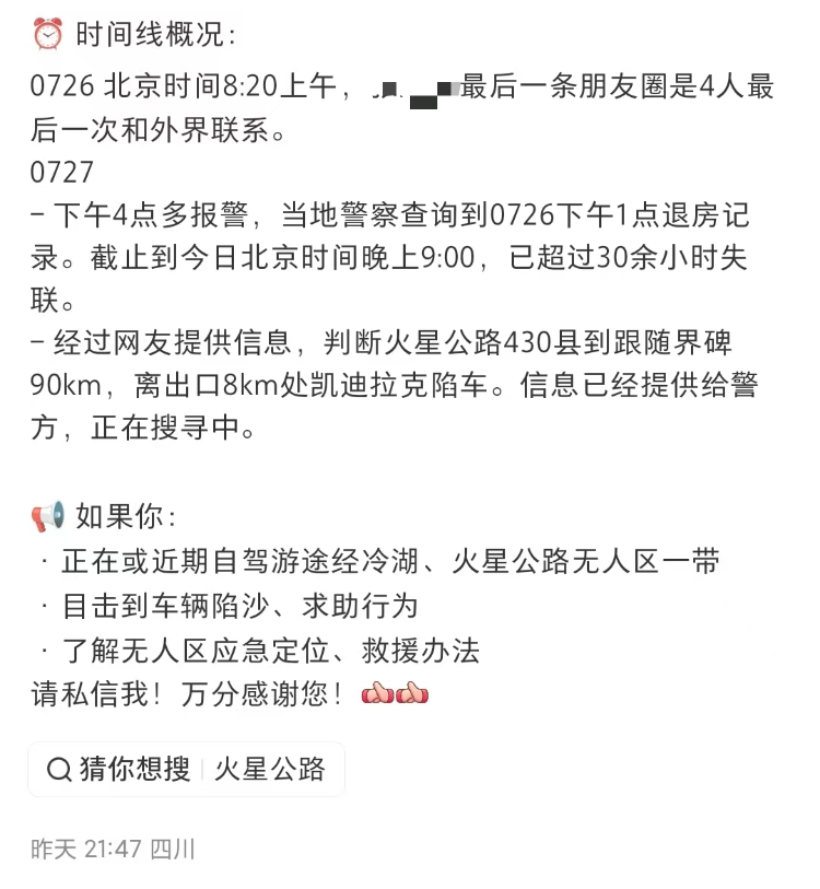 7月27日晚,多名网友在社交媒体上发帖紧急寻人,称“冷湖雅丹无人区可能有游客陷车失联,急需线索!”求助文章中称,4名中老年人自驾从新疆回四川南充,7月26日中午从青海冷湖镇出发后疑似进入火星一号公路与雅丹地貌无人区,目前已失联超过30小时,电话无法接通,未有任何新轨迹,当地警方已介入调查。