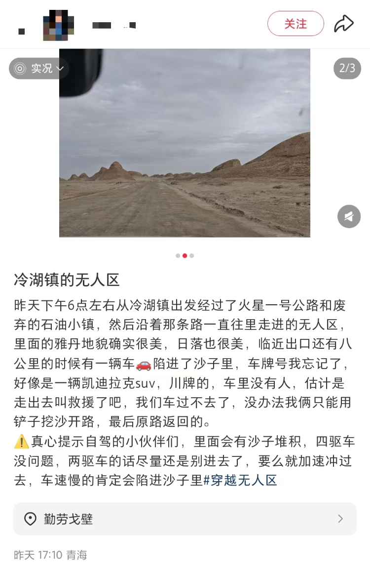 张先生表示,他们应该是开上了废弃的茶冷公路,这次获救可以说是很幸运,确实也是一个教训。据一位当地自驾领队介绍,茶冷公路是一条全长135公里的盐碱土路,连接着茶冷口和冷湖镇,废弃了近20年,部分路段已经被风沙掩埋,车辆开进去后,很容易就会失去动力和方向感。