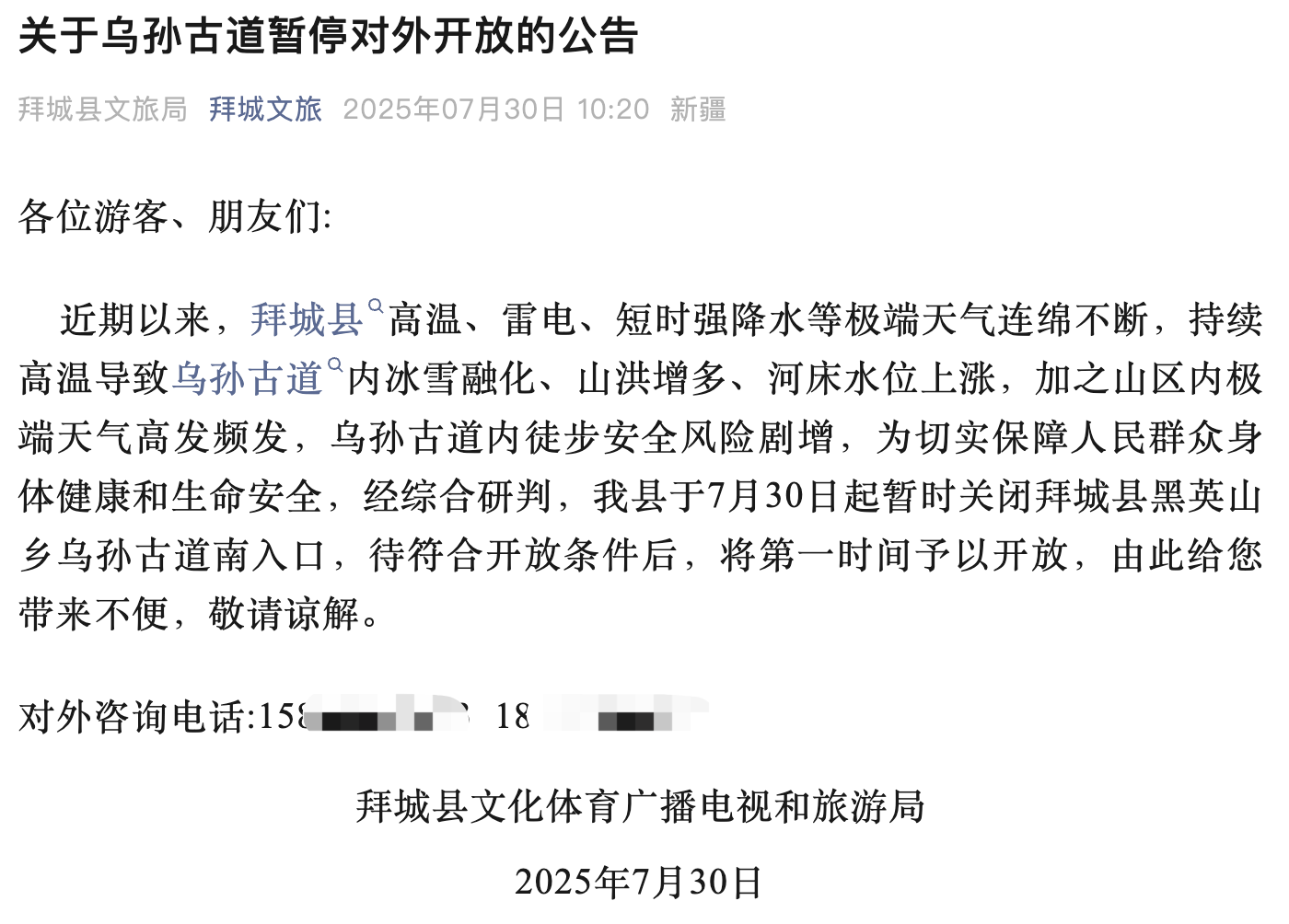 30日上午10点,拜城县文旅发布《关于乌孙古道暂停对外开放的公告》称:“近期以来,拜城县高温、雷电、短时强降水等极端天气连绵不断,持续高温导致乌孙古道内冰雪融化、山洪增多、河床水位上涨,加之山区内极端天气高发频发,乌孙古道内徒步安全风险剧增,为切实保障人民群众身体健康和生命安全,经综合研判,我县于7月30日起暂时关闭拜城县黑英山乡乌孙古道南入口,待符合开放条件后,将第一时间予以开放。”
