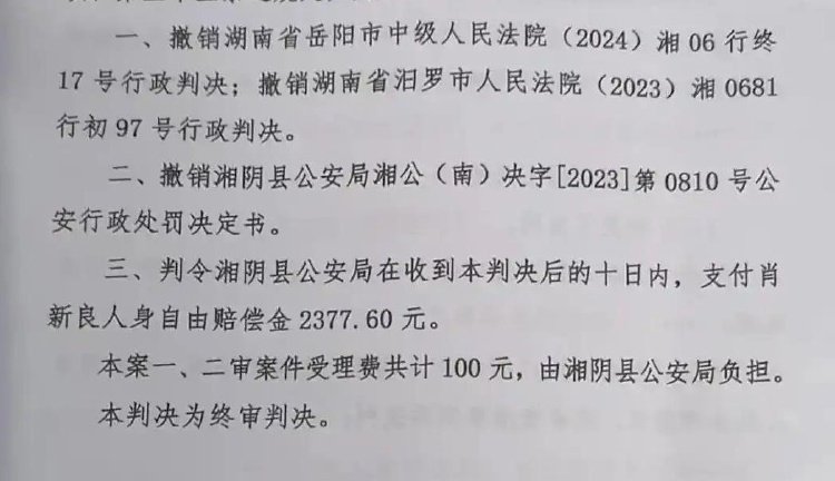 极目新闻消息,2025年6月25日,49岁的湖南湘阴人肖新良拿到了一份期待已久的判决,这份判决撤销了他曾接受的行政拘留处罚。从2023年7月开始,两年来,经历2次上诉,3次判决,肖新良终于“翻案”。而这份他力求改判的行政处罚,最初只是因为在一段30秒视频下发布的一条12字评论。(据8月7日大象新闻报道)