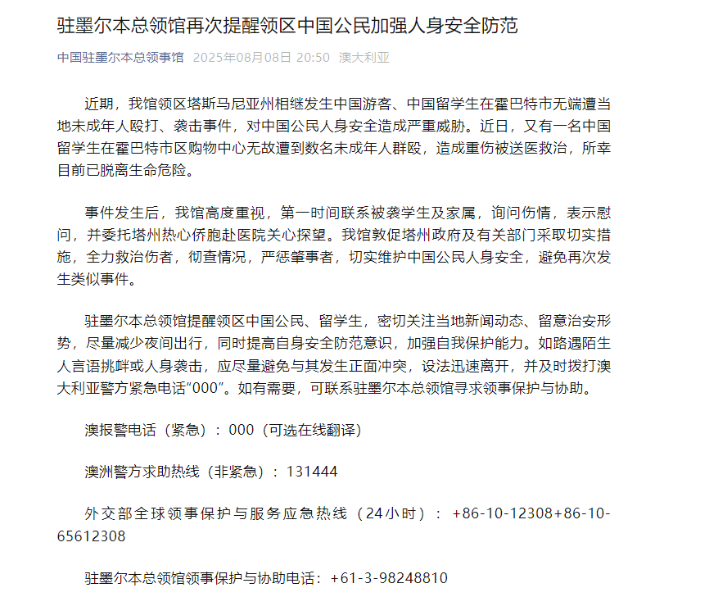 红星新闻消息,8月8日晚间,我国驻墨尔本总领馆发布公告称,近期,我馆领区塔斯马尼亚州相继发生中国游客、中国留学生在霍巴特市无端遭当地未成年人殴打、袭击事件,对中国公民人身安全造成严重威胁。