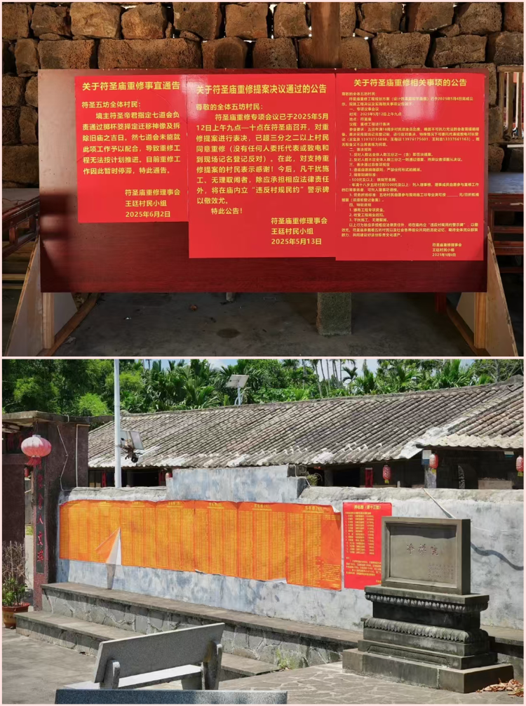 近日,有文保爱好者在社交平台发帖称,位于海南海口市龙华区龙桥镇王廷村的省保单位——清代建筑净禅院(当地称:符圣庙)将被村民私拆重建。净禅院现场张贴了三份王廷村村民小组发布的告示,其中一份公布了重建计划;第二份是一些村民对该庙重建一事进行了表决,超三分之二村民同意重修;第三份则显示,重修计划在今年6月因故暂时停滞。