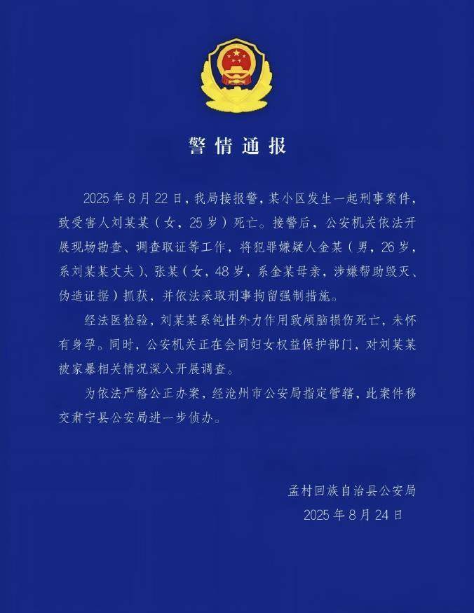 极目新闻消息,8月24日晚上,孟村回族自治县公安局发布警情通报:2025年8月22日,我局接到报警,某小区发生一起刑事案件,致受害人刘某某(女,25岁)死亡。接警后,公安机关依法开展现场勘查、调查取证等工作,将犯罪嫌疑人金某(男,26岁系刘某某丈夫)、张某(女,48岁,系金某母亲,涉嫌帮助毁灭伪造证据)抓获,并依法采取刑事拘留强制措施。