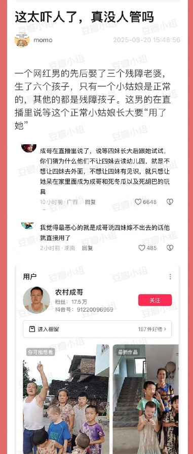 大河报消息,近日,有网友发文称,“男网红‘农村成哥’先后娶了三个残障老婆,生了六个孩子,只有一个小姑娘正常。这个男的在直播里说等正常小姑娘长大要‘用了她’。”相关信息引发广泛关注。