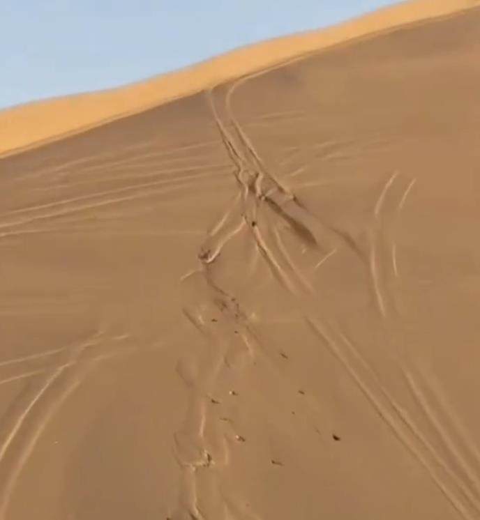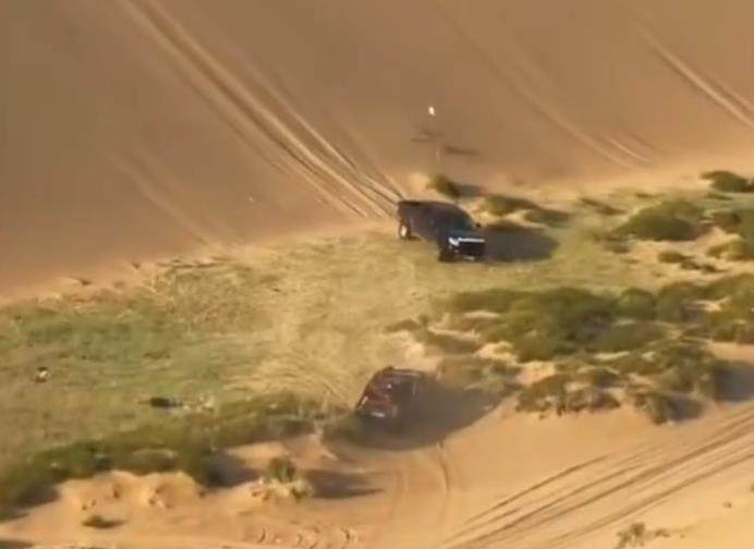 该事件引发热议后,一段行车记录仪拍下的现场视频在社交平台被转发。视频显示,一辆车从高处“骑”着沙脊往下行驶,突然改变方向往左行驶。此时,在沙脊左侧横向驶来一辆车。几秒后,两辆车发生碰撞,时间为24日18时1分。在与这段视频环境一致的另一视频中,有人称“撞的,我眼瞅着撞的”。现场车辙显示,两辆车轨迹相交后又分开。其中一辆车先翻滚至坡底,随后另一辆车正常开到坡底。