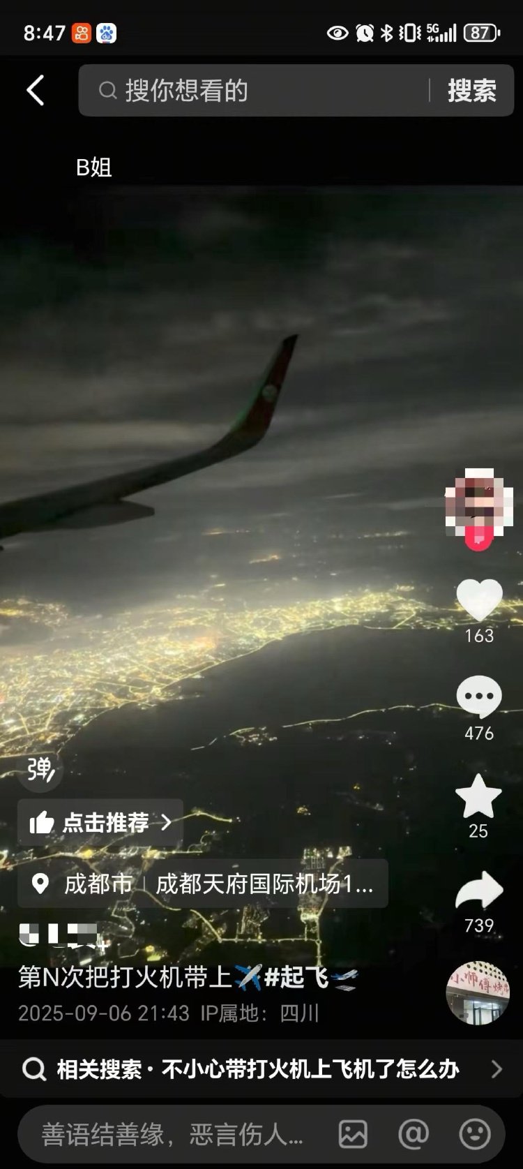 记者看到,从抖音账号定位显示是在成都天府国际机场。这位乘客称,是从天府国际机场登机起飞,“第N次把打火机带上飞机。”